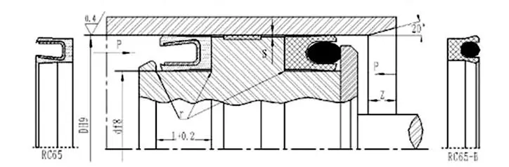 RC65-40-PTFE4+V: Диаметър на отвора 40, материалът на уплътнителния пръстен е PTFE4, пружината от неръждаема стомана е V-образна пружина.